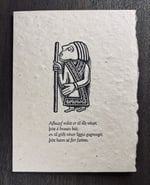 These gorgeous, Seattle-made 5.5x4.5" letterpressed folding cards feature a Viking Age Swedish archaeological find (an example of mysterious gold foil depictions known as "Guldgubber") combined with a quote from the Old Norse Hávamál, a 13th century eddic poem consisting of earlier traditional material in the format of advice from the Viking Age Scandinavian god Odin (Óðinn).